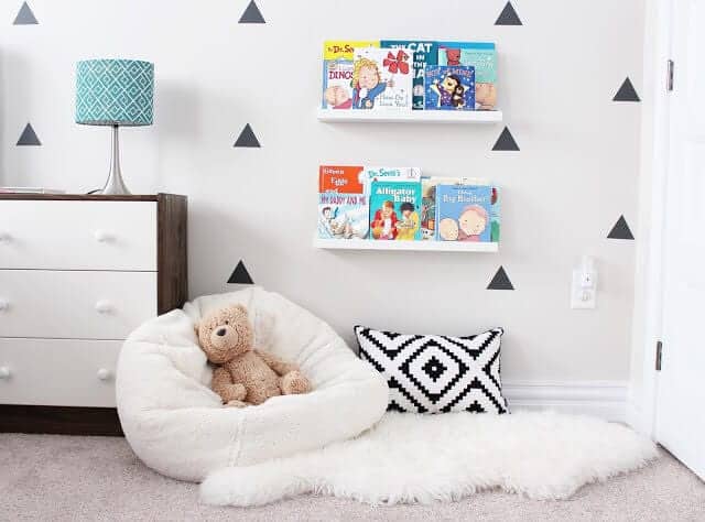 What's great about this reading area is that it offers a nice open space, as well as a closed off corner. Depending on your child's mood, she may enjoy reading in a comfy chair one day, and hiding behind the curtain the next. Anything that encourages children to be independent and imaginative gets a thumbs up in my book (no pun intended)! Also, the playful colors used here are so much fun!